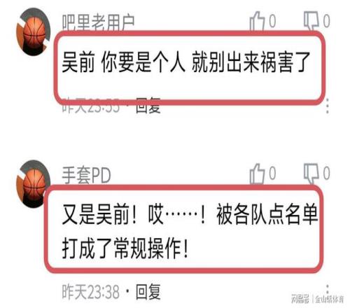 吴前关键时刻的两个低级错误,赛后也是被网友纷纷吐槽。“吴前一个无脑犯规,一个发球失误,送走比赛,不想打就回去好好继承家产吧,受不了。”;“吴前还打个鬼,还不如好好培养李月洲。”;“吴前 你,就别出来祸害了”;“又是吴前!哎……!被各队点名单打成了常规操作!”;“吴全,赶紧退役吧!”……