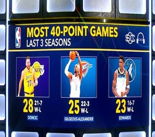 近3季40+排名:东契奇28场(21胜7负)、亚历山大25场(22胜3负)、华子23场(16胜7负)