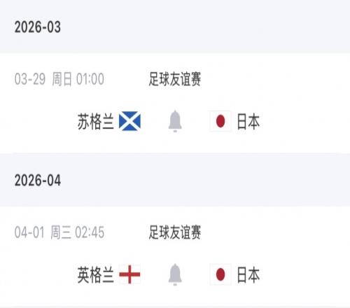 日本将于北京时间3月29日01:00交手苏格兰,4月1日02:45迎战英格兰。